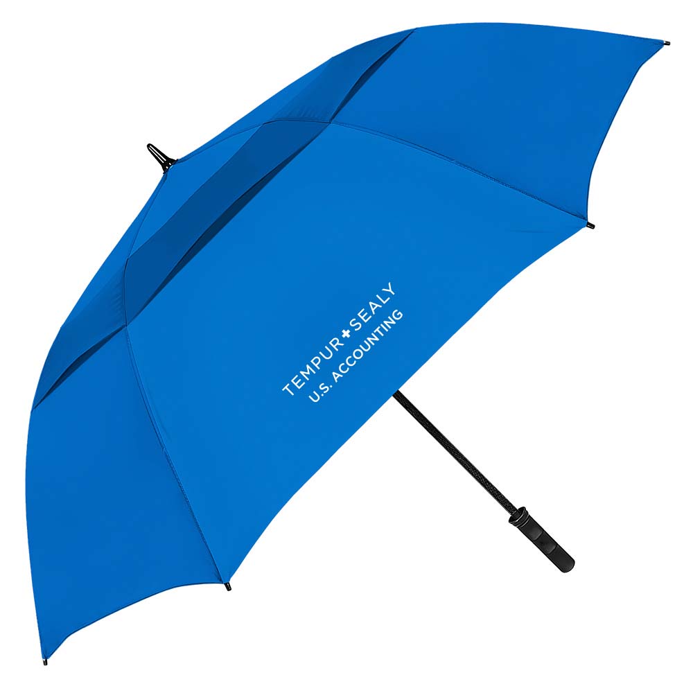 We spared no expense when manufacturing our highest-quality golf umbrella. The auto-open Vented Tornado, with its beautifully designed molded-rubber handle and all-fiberglass construction, powerfully springs open unveiling a 64″ arc. With an arc that large, comfortably fit three under our biggest and strongest golf umbrella.